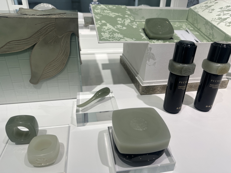 展台C位摆放着用籽玉雕刻瓶身的百雀羚新款护肤品。 戚颖璞 摄