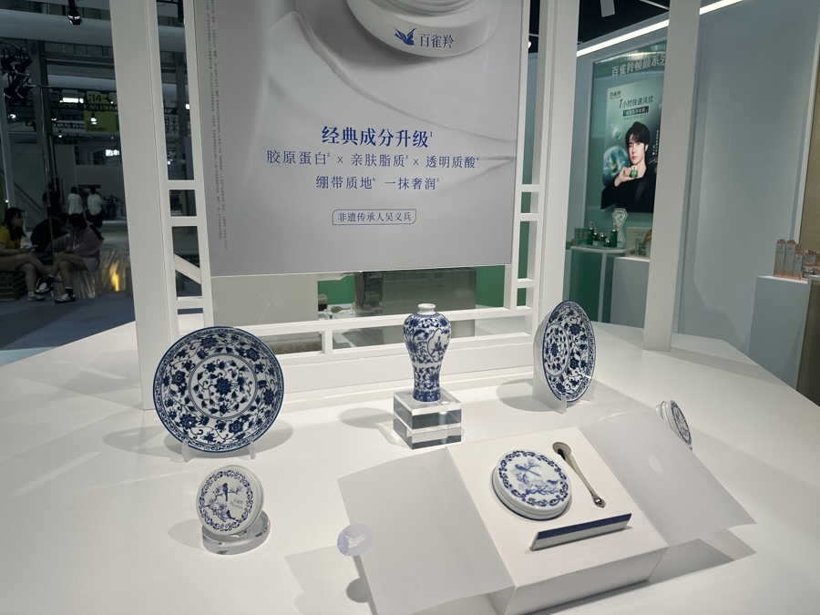 “今年,我们带来的两套护肤品系列都围绕中国文化,联合专业领域的非遗大师,分别以青花瓷和玉琮为设计理念。”百雀羚品牌部工作人员王宪玉说,这不仅仅是产品的上新,更是一次品牌升级,将百雀羚赋予“东方文化符号”。
