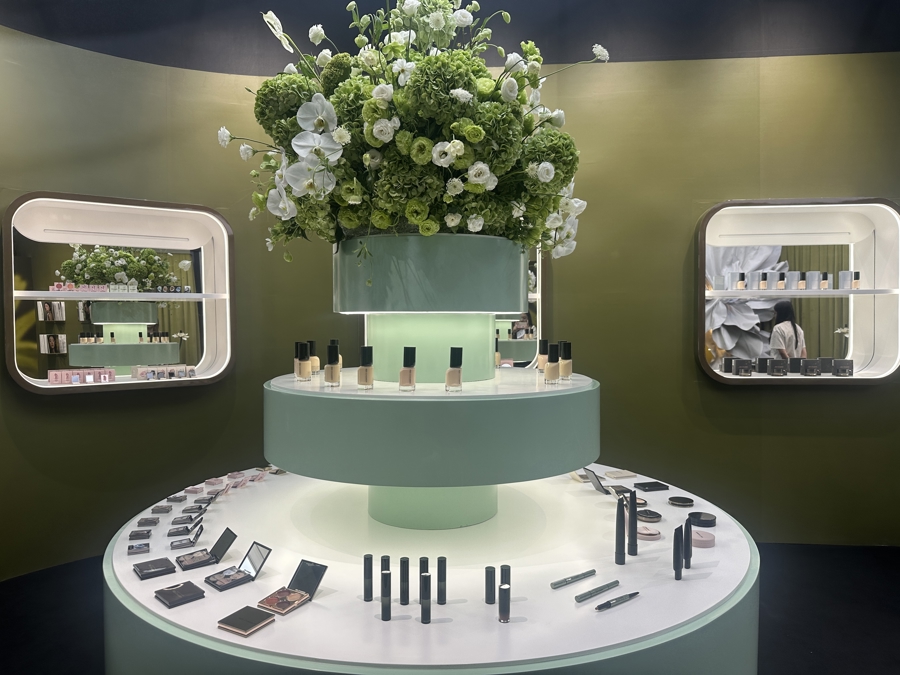 全球纯净美妆市场,长久被海外品牌占据,近年来,RED CHAMBER朱栈如同“黑马”般闯入,迅速跻身国内市场头部。走进其展台仿佛步入艺术空间,一朵巨大的银白色中国莲艺术装置,镶嵌在森绿色的幕墙上,十分吸睛。“莲花呼应了我们的主推新品‘轻密精华粉底液’,其在配方架构上就区别于传统粉底液,把基底从水或乳化剂换成了高浓度的中国莲精粹。”朱栈生物科技品牌部工作人员Jennie透露设计背后的巧思。