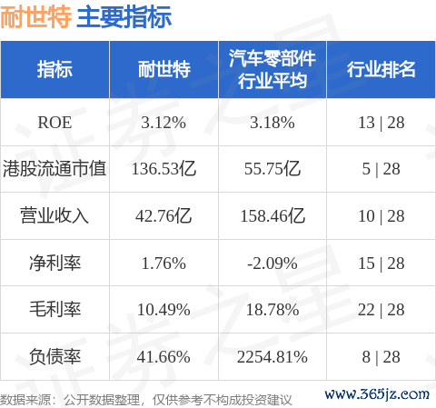 耐世特港股市值136.53亿港元,在汽车零部件行业中排名第5。主要指标见下表:
