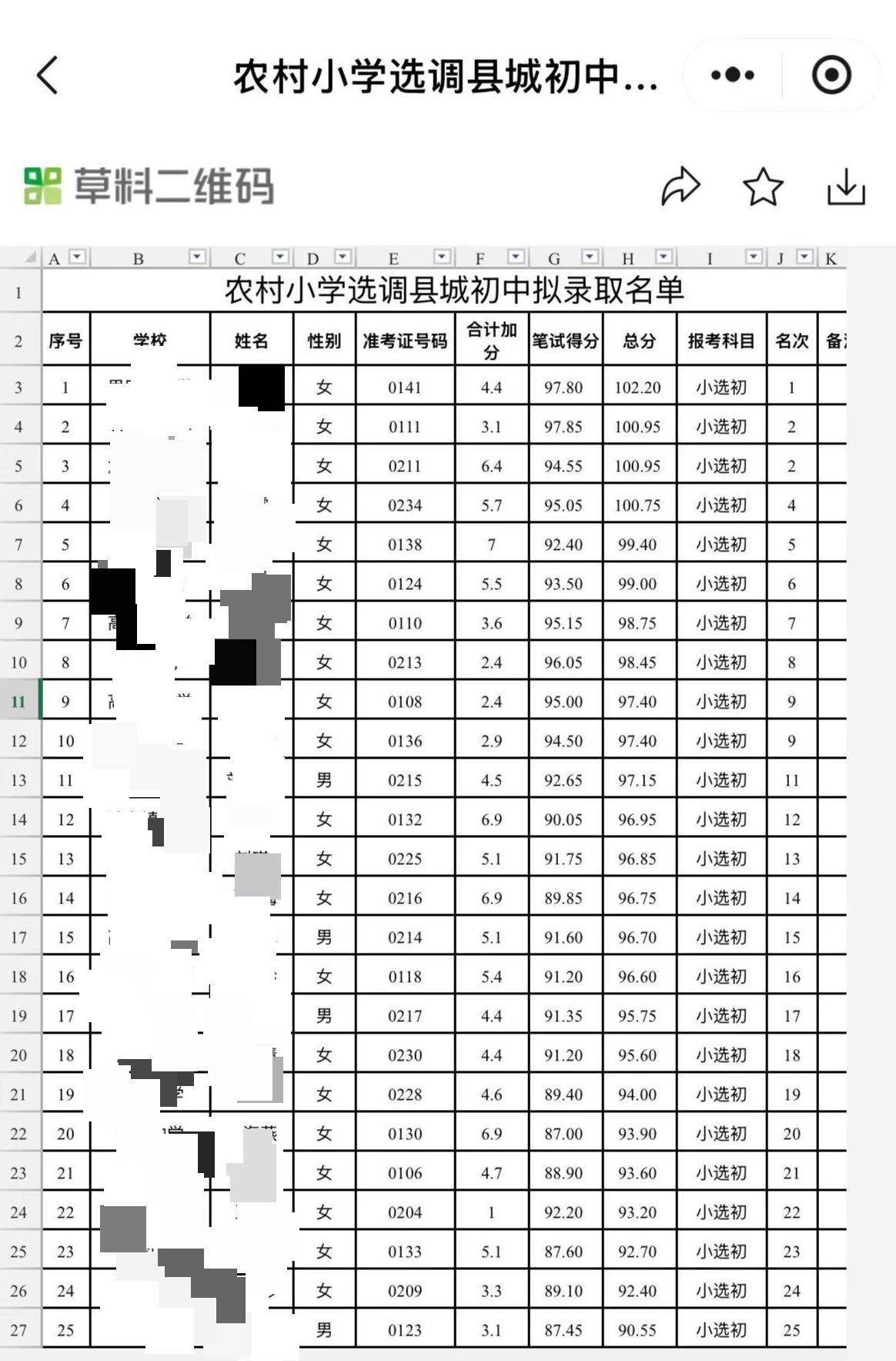 农村小学选调县城初中拟录取名单